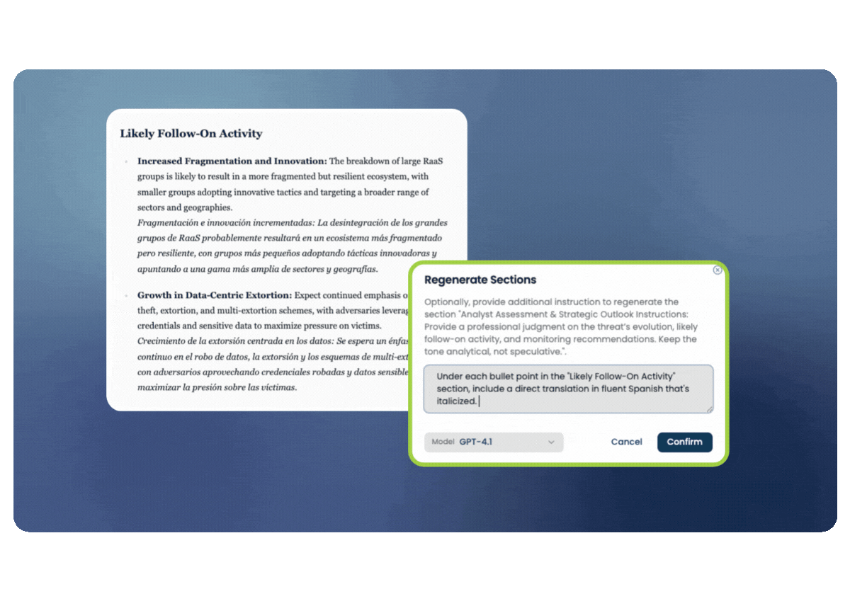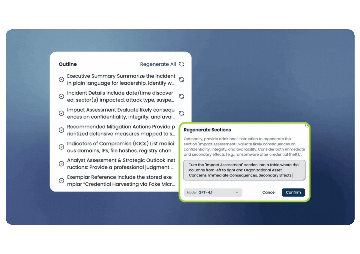 Indago lets you isolate individual sections, give more targeted instructions, and regenerate content instantly. Make unlimited refinements with AI-assisted editing until your report reads exactly the way you need it to.